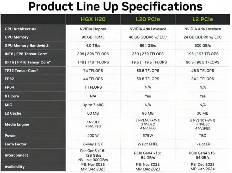 前不久分析师郭明錤透露,英伟达H20 AI GPU芯片有望于2024年第二季度开始量产,纬创为基板独家供应商。另外两款GPU产品L20、L2均为PCIe 4.0 x16板卡形态,采用英伟达Ada Lovelace架构。这两款产品分别搭载48GB、24GB GDDR6显存,算力相比H20更低。