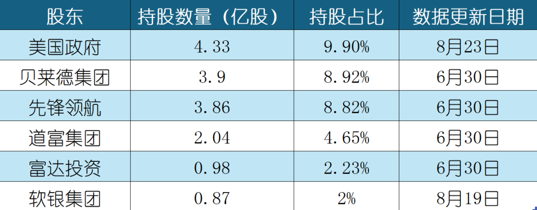 在软银和美国政府的股权收购后,英特尔最大股东为美国政府,软银持股比例排在第6位。