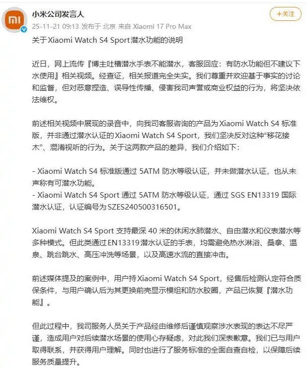 11月21日,小米公司发言人官方微博发布“关于Xiaomi Watch S4 Sport潜水功能的说明”。
