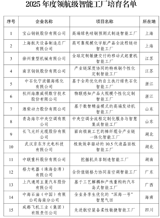 首批公布的领航级智能工厂共15家,涵盖装备制造、原材料、电子信息、消费品等多个关键行业。其中京东方、海康威视等厂商均在列。