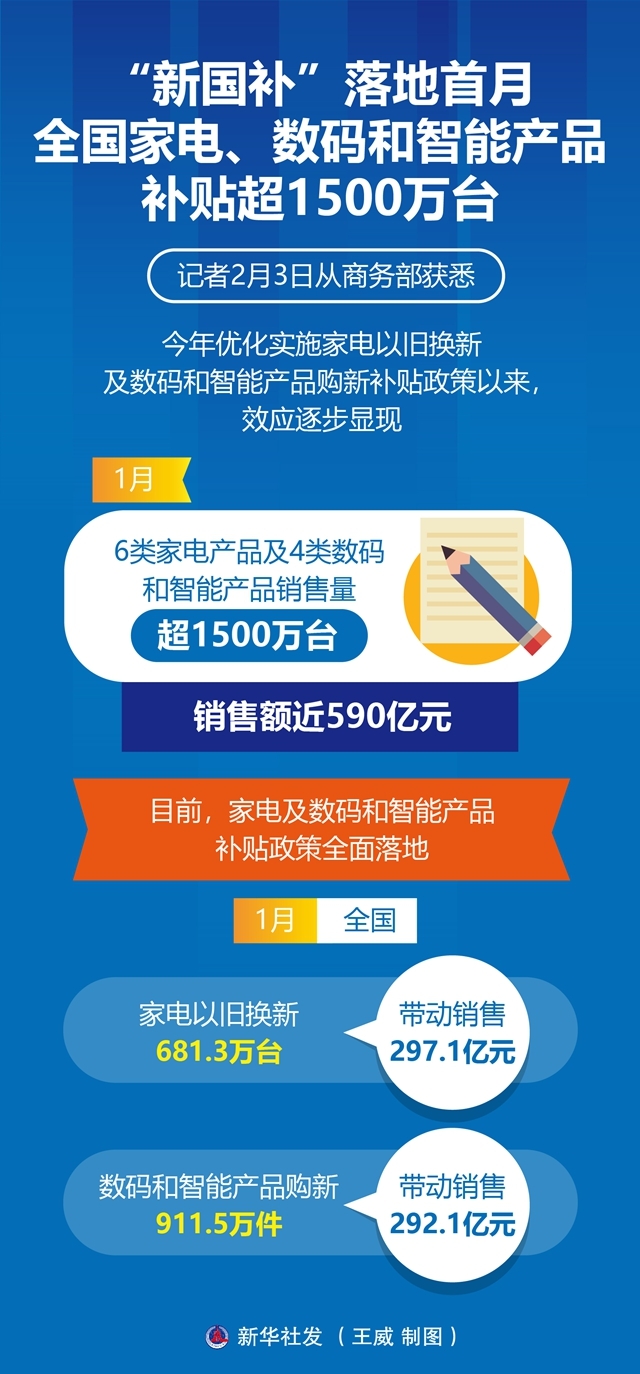 记者2月3日从商务部获悉,今年优化实施家电以旧换新及数码和智能产品购新补贴政策以来,效应逐步显现。1月,6类家电产品及4类数码和智能产品销售量超1500万台,销售额近590亿元。