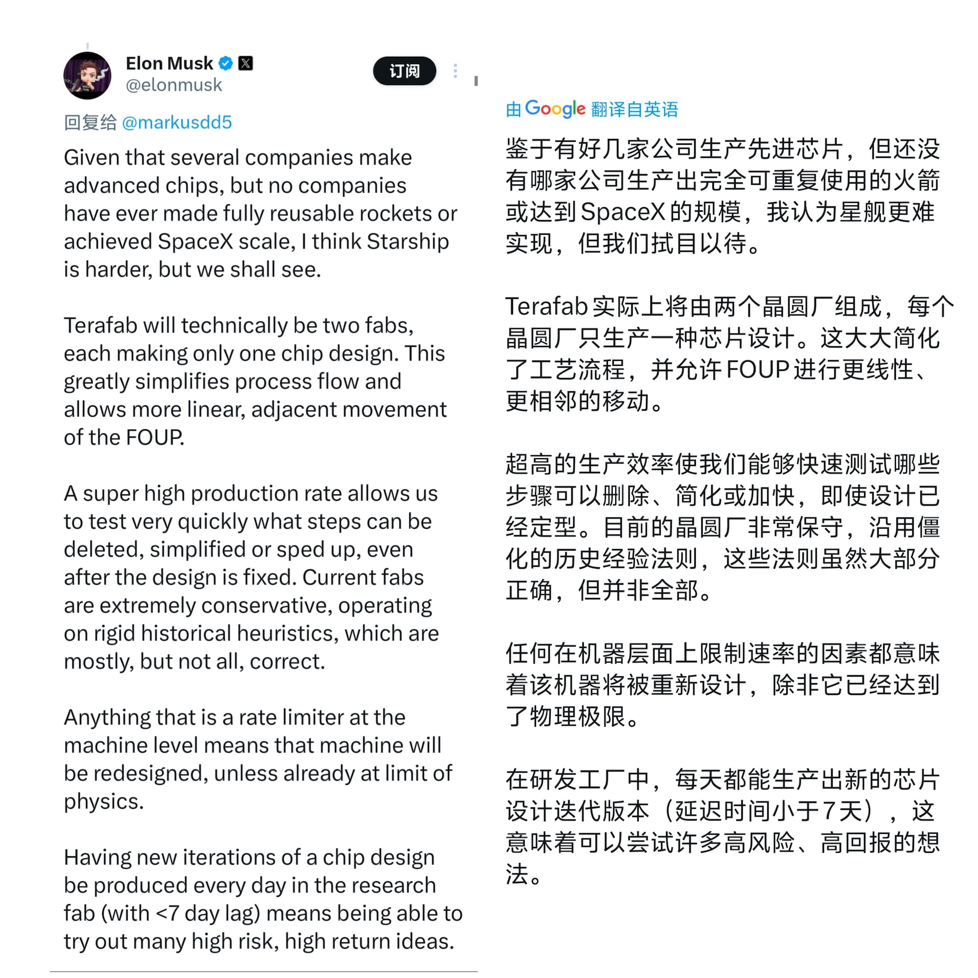 马斯克在X平台回复网友时进一步介绍了如何在Terafab实现更高的芯片生产和设计迭代效率(左侧为原文,右侧为X自带的谷歌翻译)。